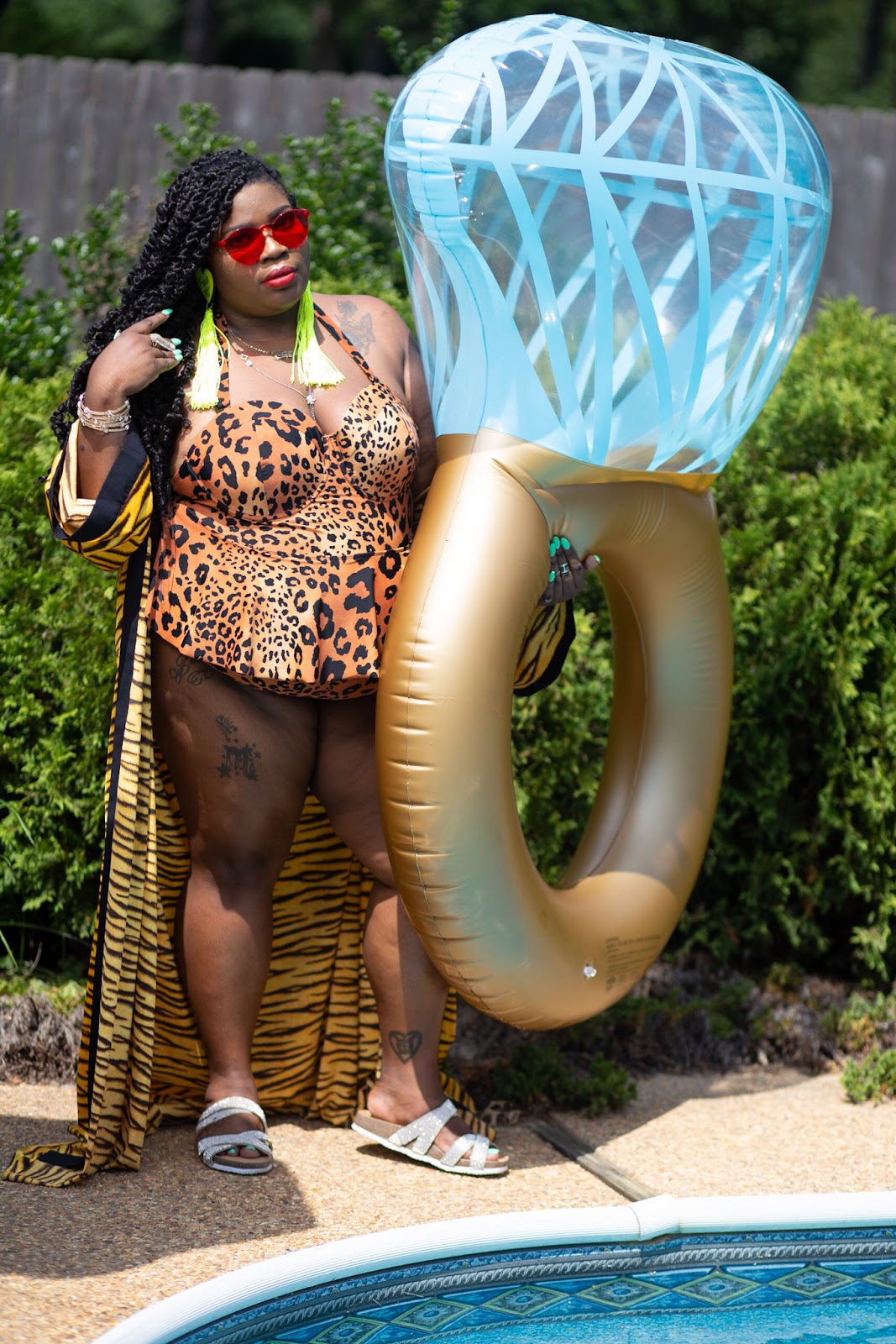 This cute lil one piece is from forever 21 and it runs a lil big. I bought my regular size in Forever 21 in which is a 2x mostly and the cups were kinda big on me so this is big boob friendly and its on sale! You can find it here. Earrings are from https://rashidagurl.com. My sparkly sandals are Torrid and can be found here. This lovely kimono/robe is by Rih’s line Savage Fenty and can be purchased here but guess what Im giving one away to one of my subscribers. My red glasses and my lipstick are by maybelline but I got them from amazon and you can get them here.